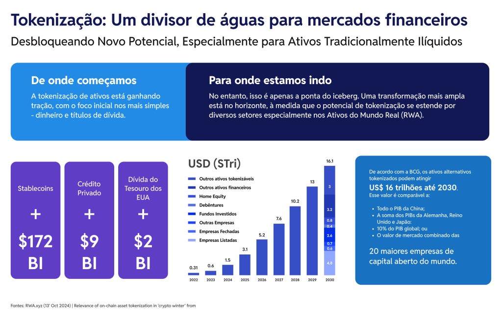 A tokenização está saindo do piloto e se tornando mercado. Segundo o relatório da BCG citado no Brazil Tokenization Report 2024, o volume global de ativos tokenizados já ultrapassa: